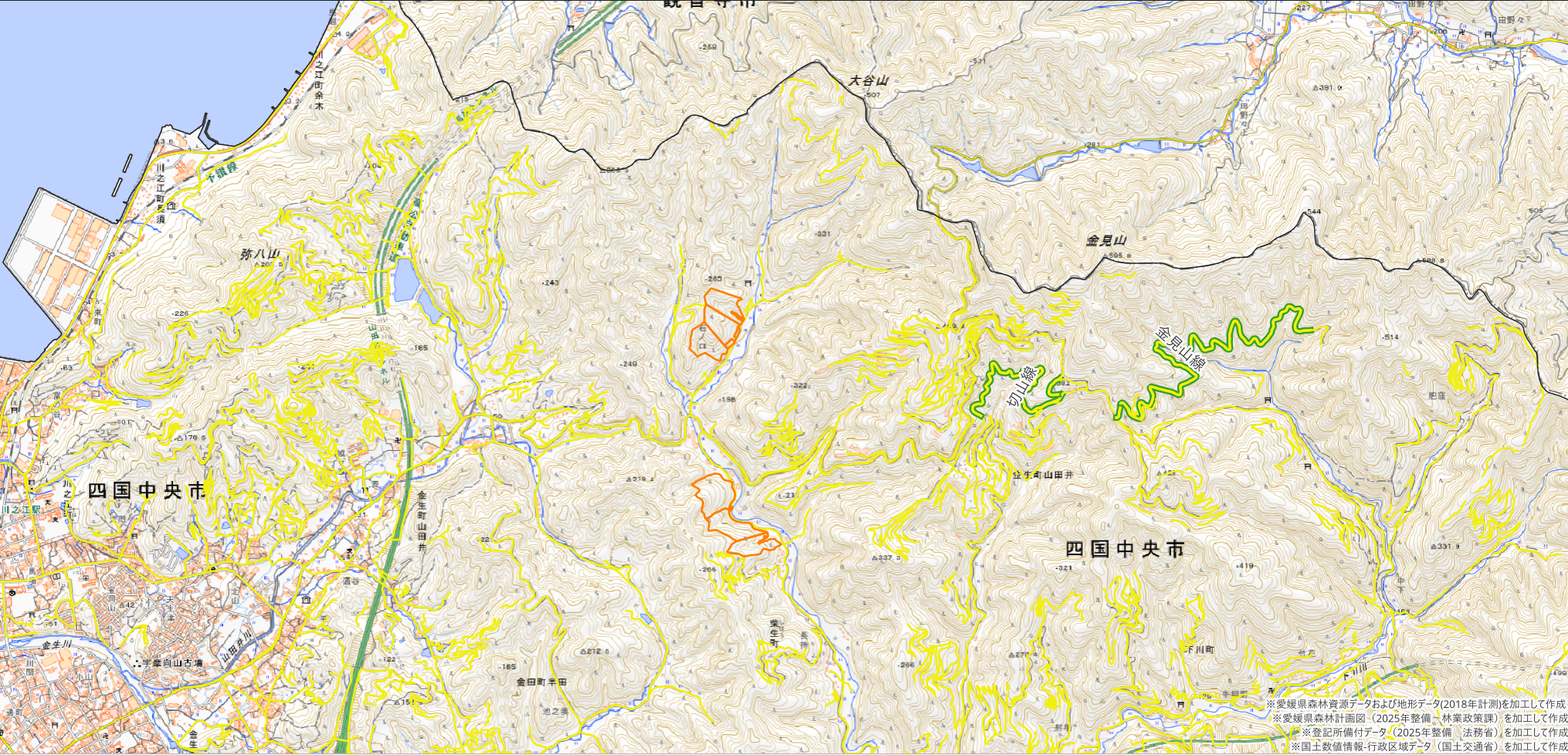 ※こちらは四国中央市金生町山田井の区域を示しており、実際の山林の区域とは異なります。